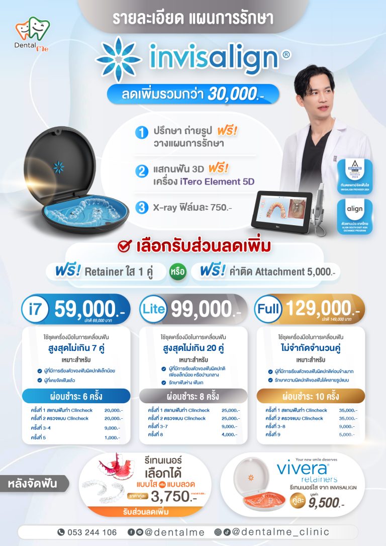 การจัดฟันใส Invisalign คือ การจัดฟันอีกทางเลือกหนึ่งสำหรับคนไข้ที่ไม่ต้องการจัดฟันแบบเดิม ที่เป็นแบบโลหะ เนื่องจากการจัดฟัน Invisalign จะเป็นเครื่องมือจัดฟันที่จะมองไม่เห็นเวลาคนไข้ พูด หรือ ยิ้ม ซึ่งจะเหมาะสำหรับคนไข้ที่ต้องการจัดฟันแต่ไม่ต้องการให้คนอื่นมองเห็นเครื่องมือจัดฟันที่เป็นโลหะ ลวด หรือ ยางสี ที่อยู่ในปากแบบเครื่องมือจัดฟันสมัยก่อน ซึ่งทาง Dentalme clinic ของเรามีทันตแพทย์ที่มีความชำนาญ และ เครื่องแสกนฟัน 3D